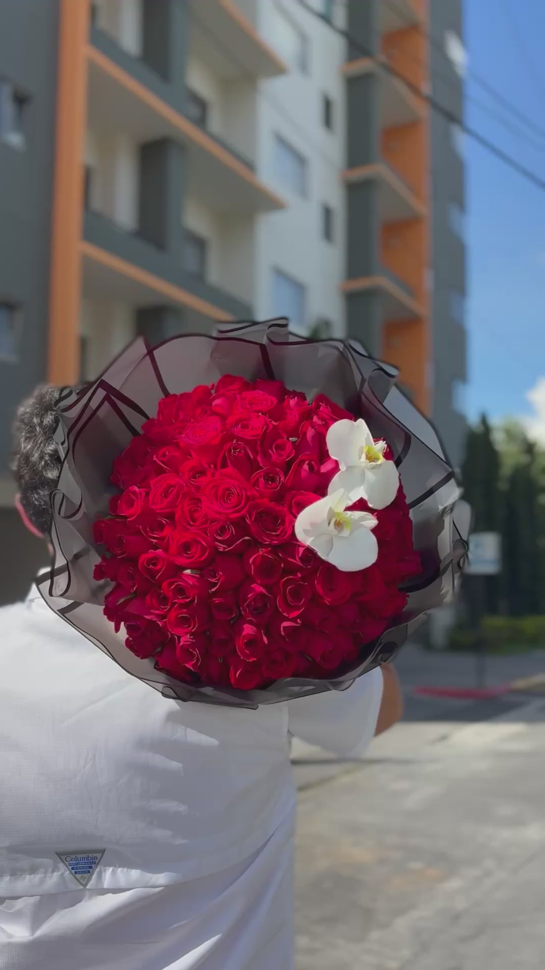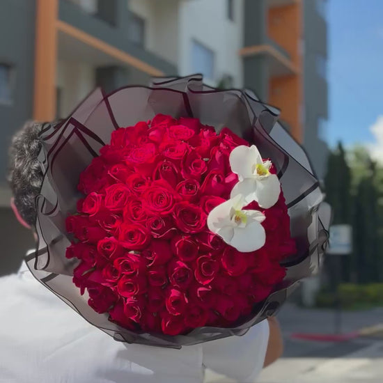 ¿Por qué conformarse con lo normal cuando puedes regalar lo extraordinario? Este diseño lleva el estilo 'Buchón' a un alto nivel. La densidad de las rosas rojas crea una textura de terciopelo inigualable, acompañado de hermosas orquídeas que crea sofisticación moderna. Un regalo diseñado para dejar huella.